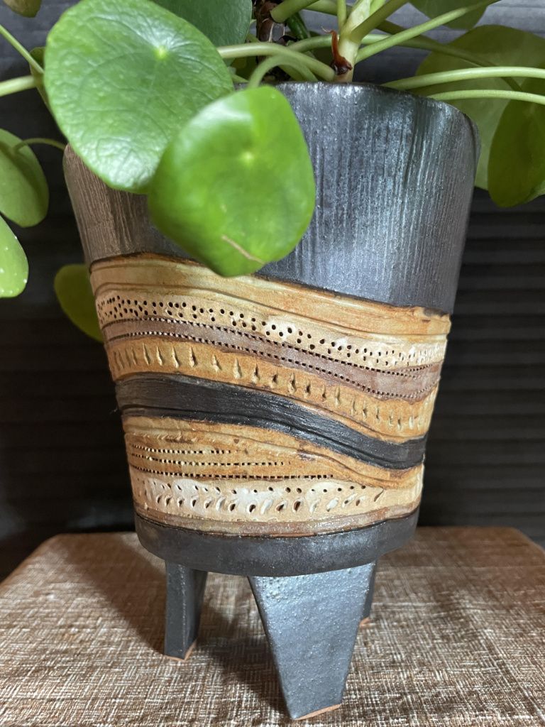 Like so many others, Jen first fell for ceramics in high school. 45 years later, arriving at a ceramics class in Eltham, her hands still knew what to do. Over the last few years Jen has been a regular at the Eltham shared studio, spent 3 weeks in a pottery studio in Japan, and has exhibited her work several times. Focussing on handbuilding, Jen uses coil and slab techniques to create works which are both functional and highly textured. Decorative elements often reflect the rocky soils and contours of the land. Each piece is finished with slips, oxides and glazes using colours drawn from the Australian bush.